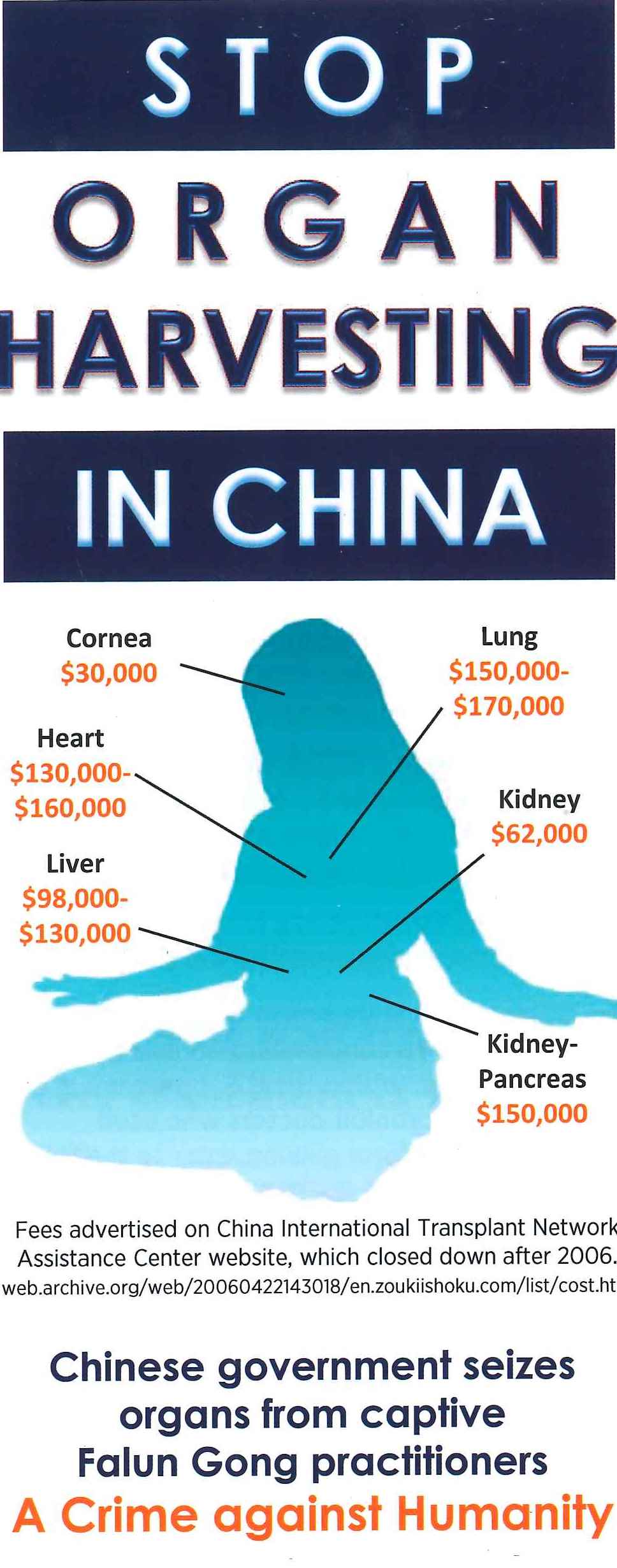 Falun Gong became wildly popular, and soon people were meditating in public parks by the thousands.  The government saw this as a threat and began to crack down.  Adherents are now routinely thrown into labor camps and tortured.  According to the brochure, captive Falun Gong practitioners are blood-typed and used as a large, live organ donor bank, killed on demand for “transplant tourists”—people who travel from other countries and pay for an organ transplant.  Do they know that someone will be killed to save their lives?  How can they not?  Again, according to this brochure, the wait for a kidney in the U.S. is five years.  In China, it’s 15 days.  Well that is slightly suspicious, don’t you think?