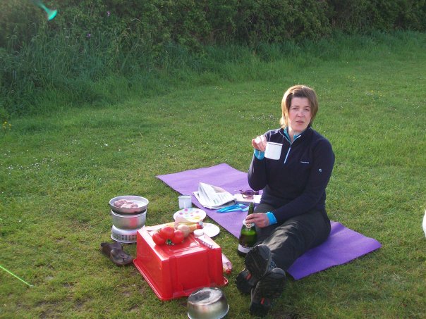 Rebecca is a great cook, and she managed to make lamb stew with spring potatoes and peas on a camp stove. Here she is doing her impression of a posh Oxfordshire camper, complete with pinky aloft.