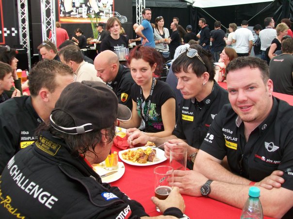 We waited for our first feeding, aka lunch, and shortly before noon the pit crews from the rack track poured in. BMW must have reckoned it might as well feed them the good grub, too.