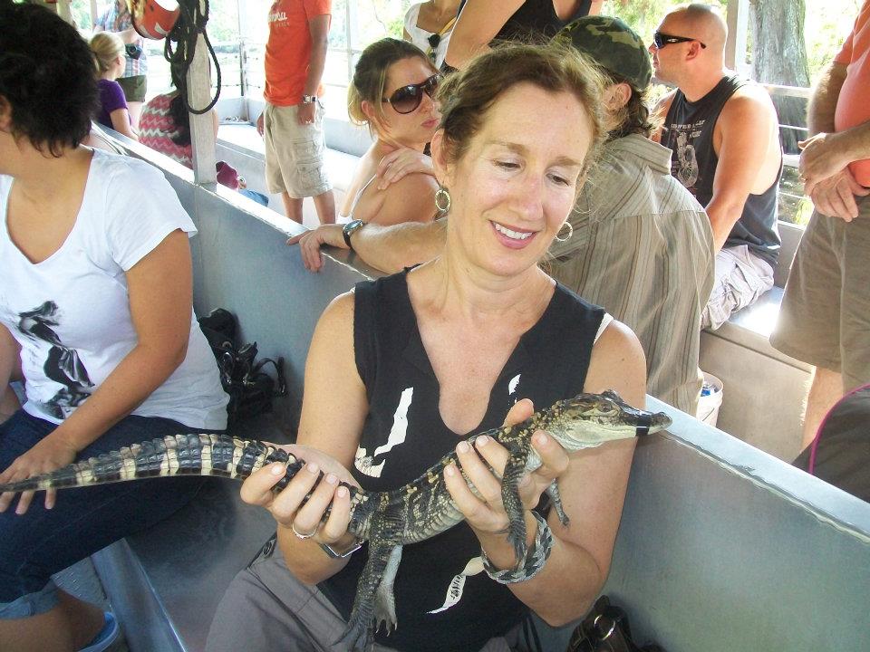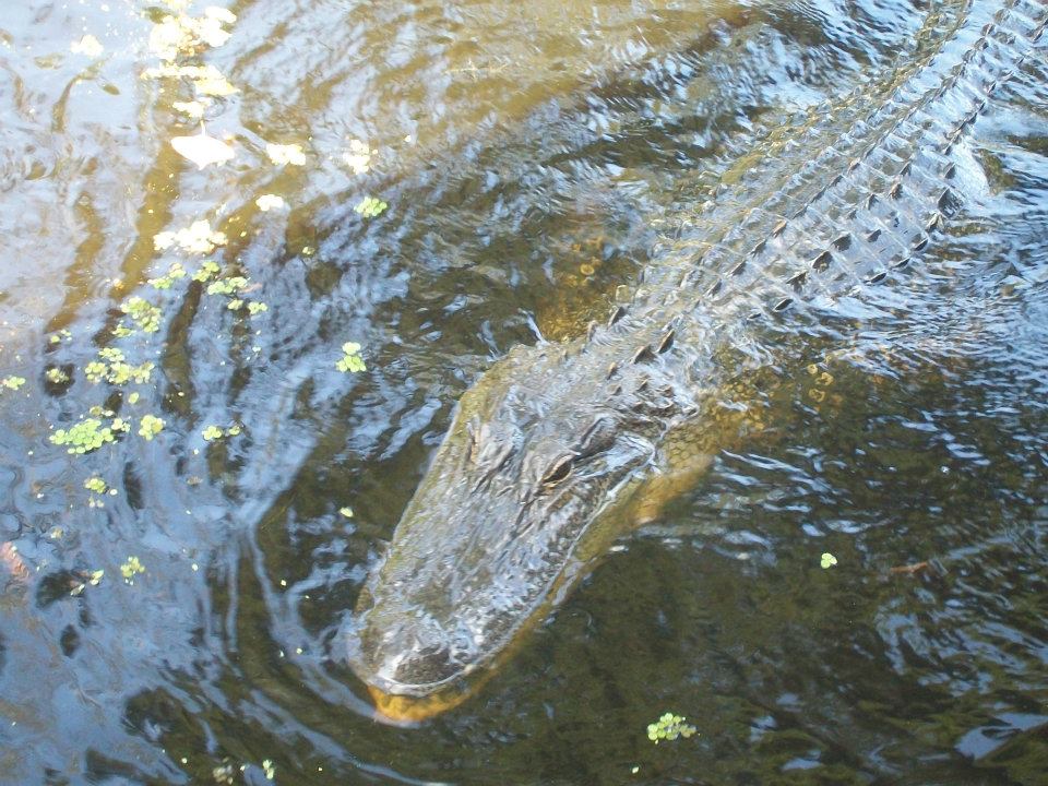 To demonstrate the “alligators like white” principle, he pulled out a bag of giant marshmallows and scattered them onto the surface of the water. We were quickly surrounded by alligators, some of which were nine or 10 feet long. Then the Cajun pulled out a bucket of chicken parts. He extended a rickety plank out over the water, then knelt and held a chicken leg over the water. It was kind of like feeding a goat in a kiddie zoo, except here you could get your arm ripped off. Each time a gator launched itself out of the water and grabbed a hunk of chicken, the Cajun would yell, “Whoa! Whoo daddy! Whoo mama!” and jump back, causing the boat to rock precipitously. This went on for a couple hours.