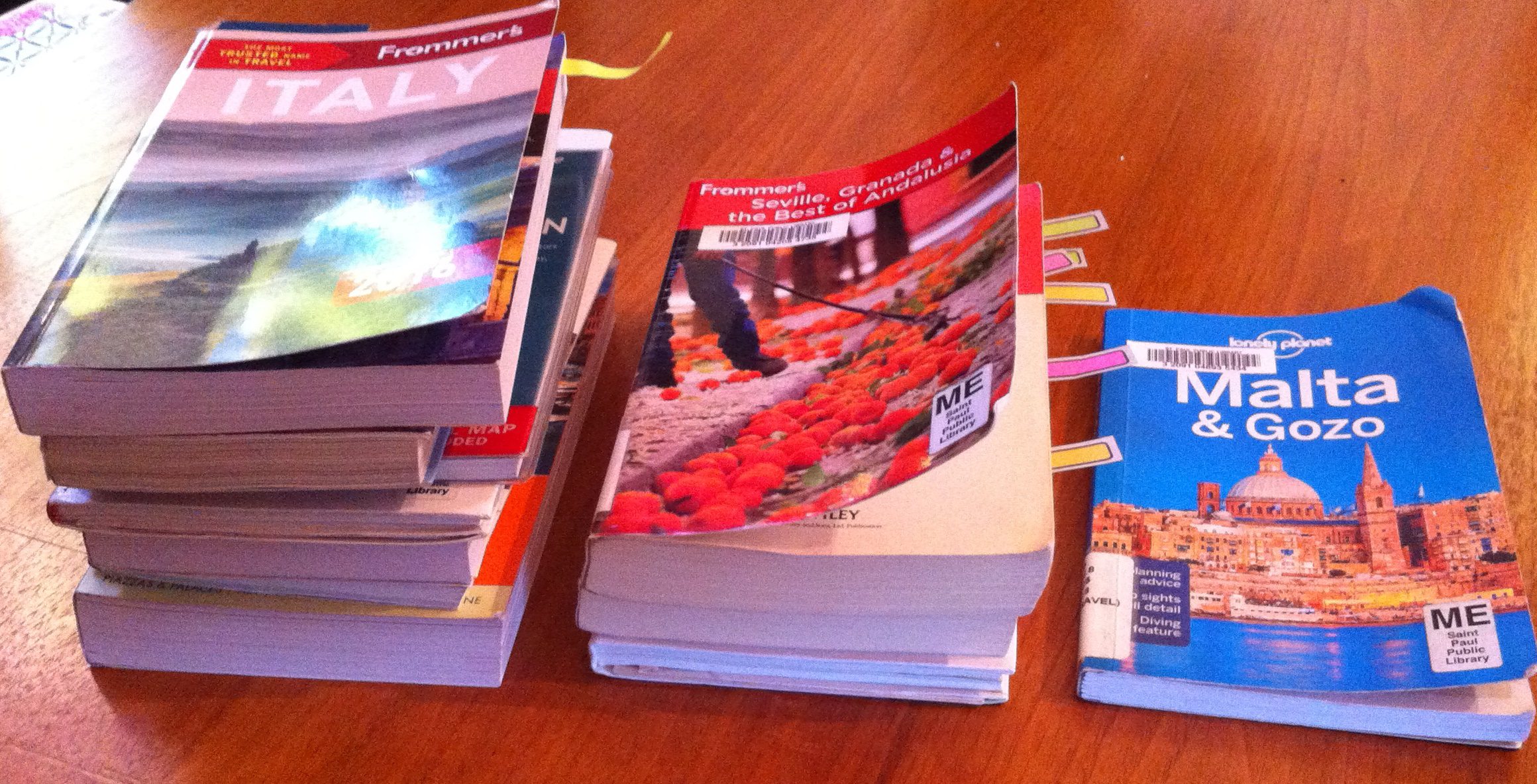 Here is a representative sampling of travel books available in the library for the three countries I’ll be visiting: Italy, Spain, and Malta. There was a whole shelf of books about Italy, a half shelf for Spain, and one slim volume about Malta. This should have told me something about what a hot (not) tourist destination Malta is. But once I get something fired up in my imagination, there’s usually no turning back.
