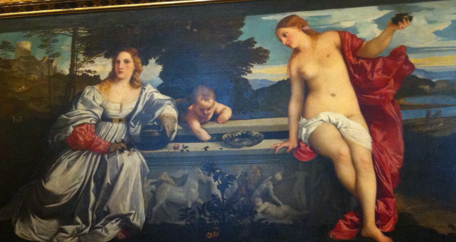 The painting below depicts a virtuous vs. sinful woman. It’s not what you think—the naked one is virtuous because she isn’t hiding anything. You know us women–always keeping important secrets from men.
