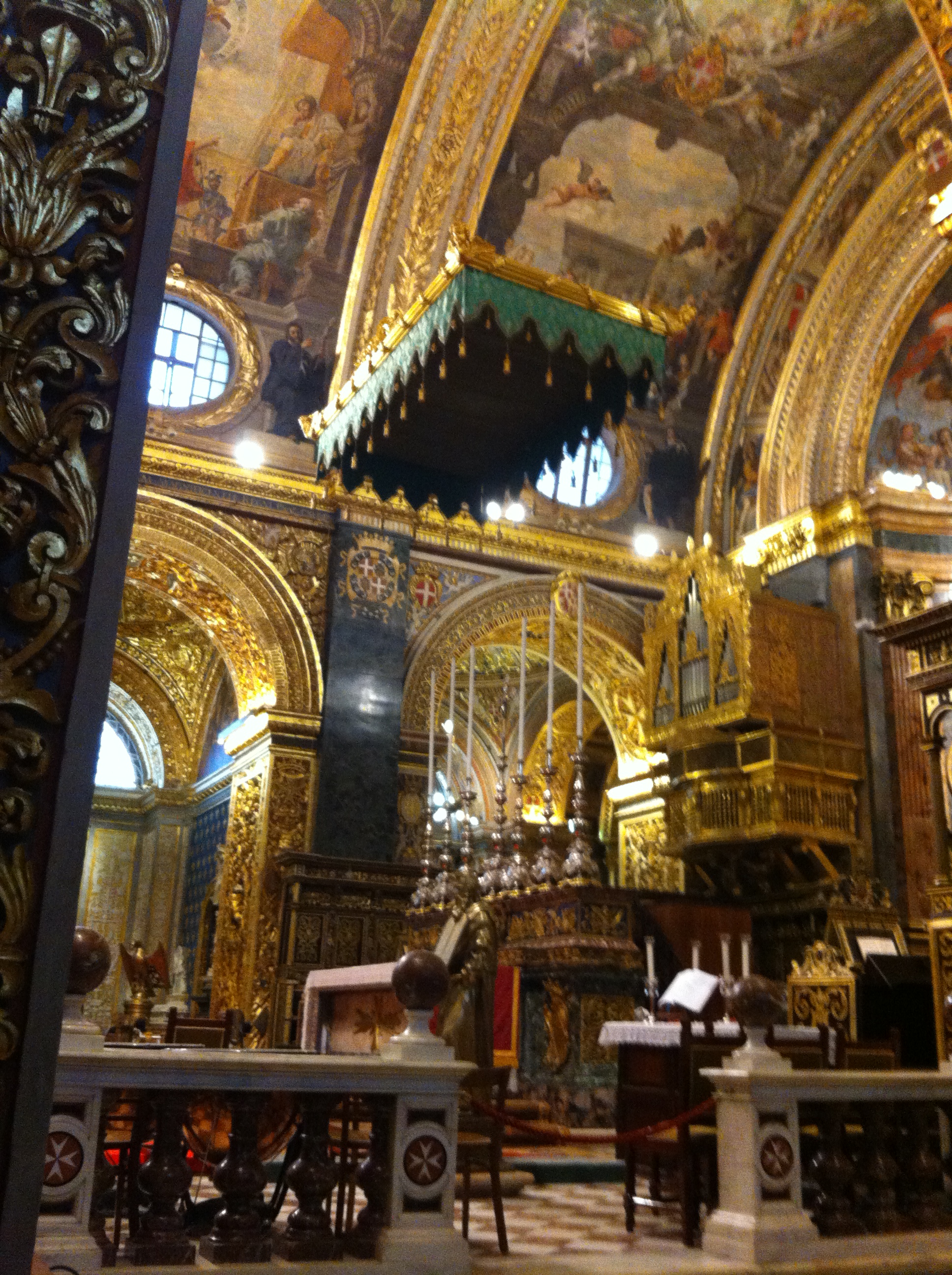 As usual I found myself wishing I had read up more ahead of time. Why was it called a co-cathedral—“co” with what? It was built by the Knights of Malta. All I knew about them was that they provided security for the crusaders. Obviously they had more money than they knew what to do with. How did they acquire it?