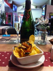 “Ooh, let’s find out!” Lynn enthused as we tried for 15 minutes to flag down one of the teen employees who were loitering in a clutch at the bar. The mussels with chips arrived, along with a bottle of bubbly, and here’s what they were: