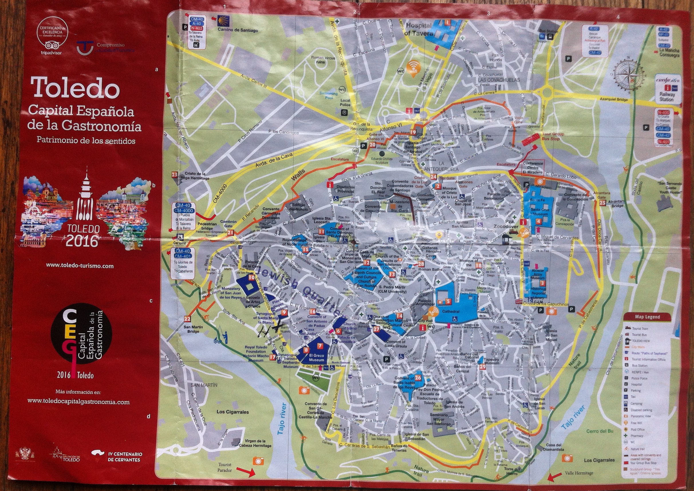 Lynn and I had a wander around Toledo. That’s the only way to approach it—as a wander— because there isn’t one straight street that runs for more than a city block. Here is a photo of our battered map we consulted seven times a day, and still managed to get turned around:
