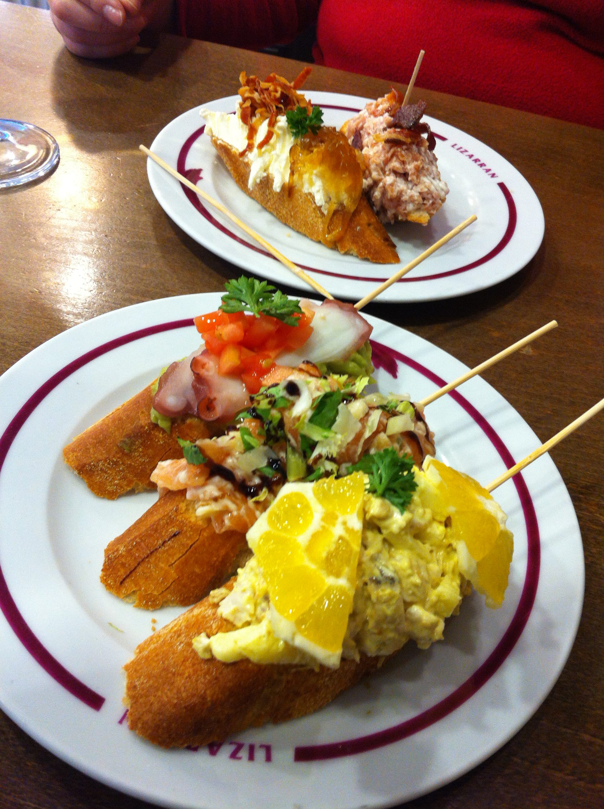 “Something with ham, pulpo—octopus; cerdo—pork; ensalada de pavo con naranja—turkey salad with orange; something with ham; salmón—salmon .…”