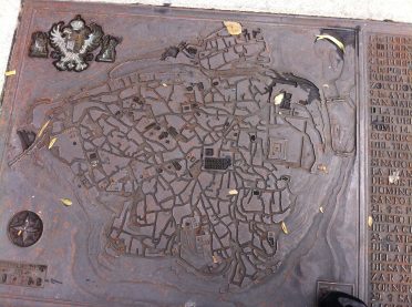 I do remember the San Fe Museum … oh, wait. On the map they look like the same thing … two museums possibly sharing one building? … online it describes “the hospital” of Santa Cruz. Here’s a map of Toledo that was set in the sidewalk to illustrate what a jumble it is.
