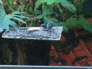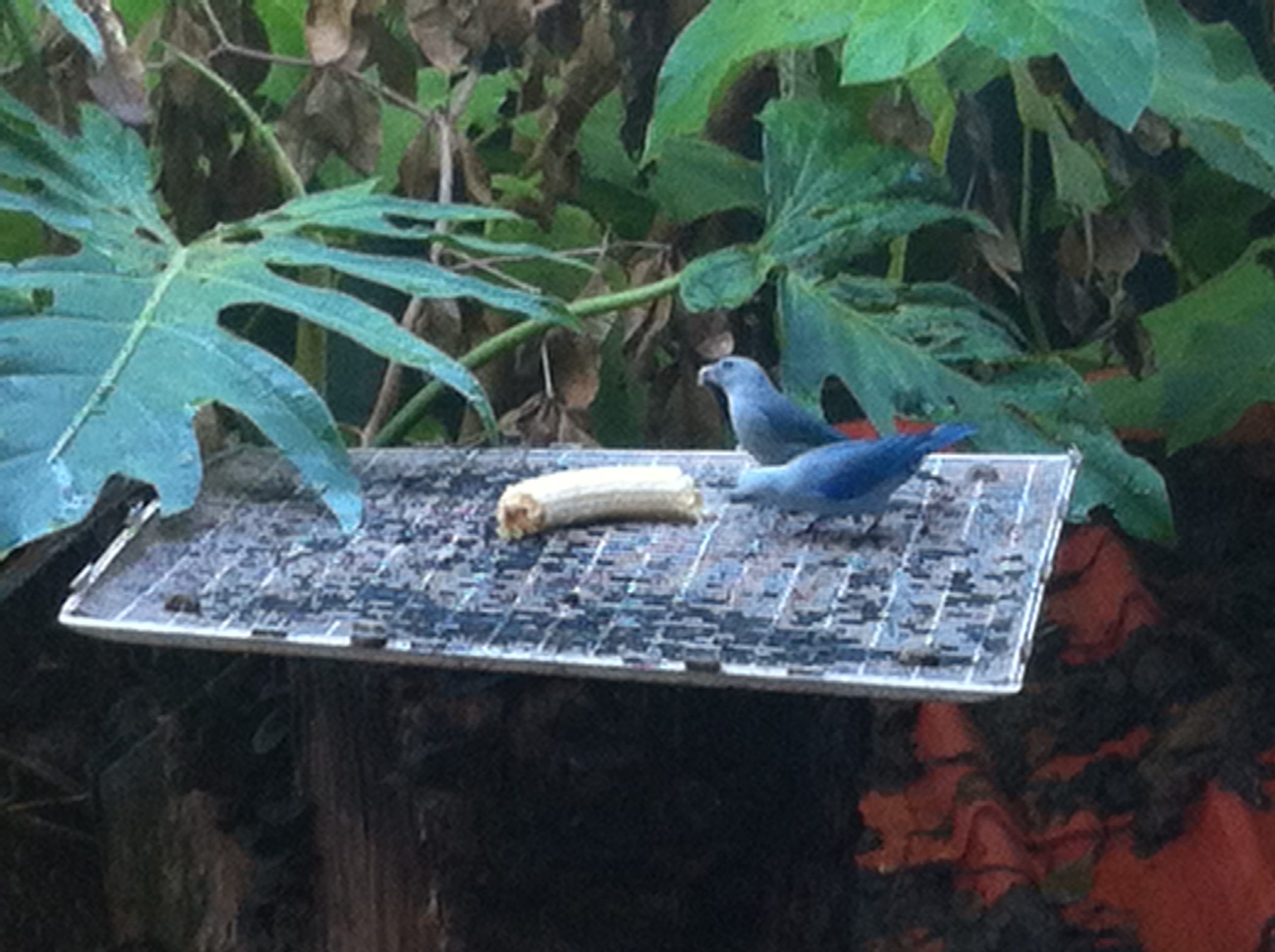 There were clouds of birds around the feeding platforms. I managed to snap these two little fellows eating bananas. Who knew that birds ate bananas?
