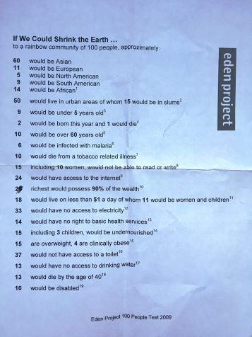 These stats were on a gigantic sign at the entrance to the Eden Project. Lynn and I stood there for a long time contemplating it. I can’t remember if the hand edit was there when I picked it up, or if I did it. Apparently, the number of rich people who own almost everything in the world has shrunk from 20 to two since 2009. The Great Recession was great—for those two people.