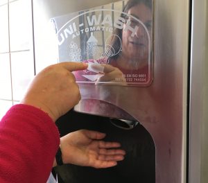 Now, when I say “beach day,” don’t imagine sun and beach umbrellas and people in bikinis and speedos. Here is a photo of Lynn attempting to use the combo washer/dryer in the public toilet. Note she is wearing polar fleece.