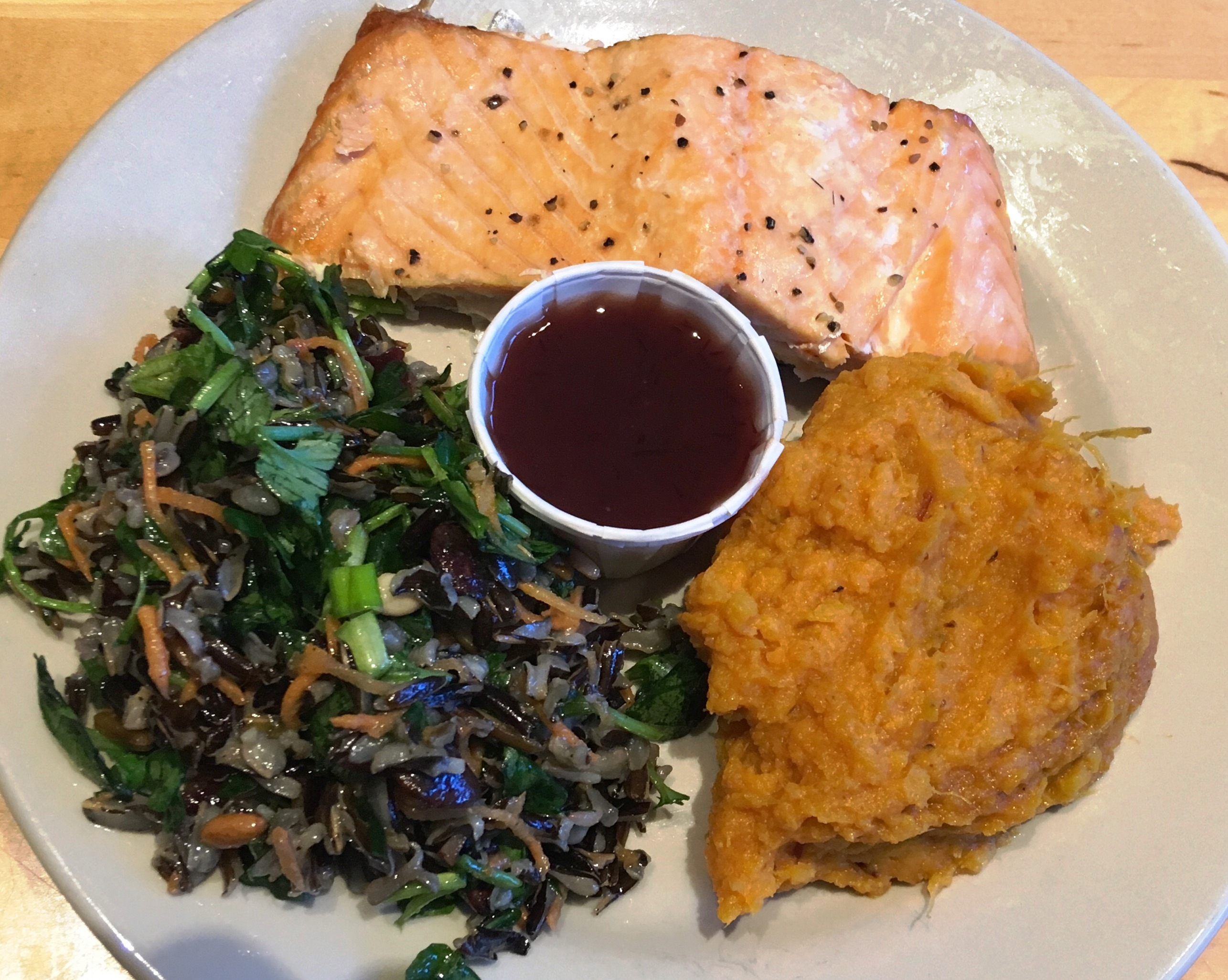 I filled my plate with salmon, a wild rice salad with water cress, and mashed sweet potatoes.