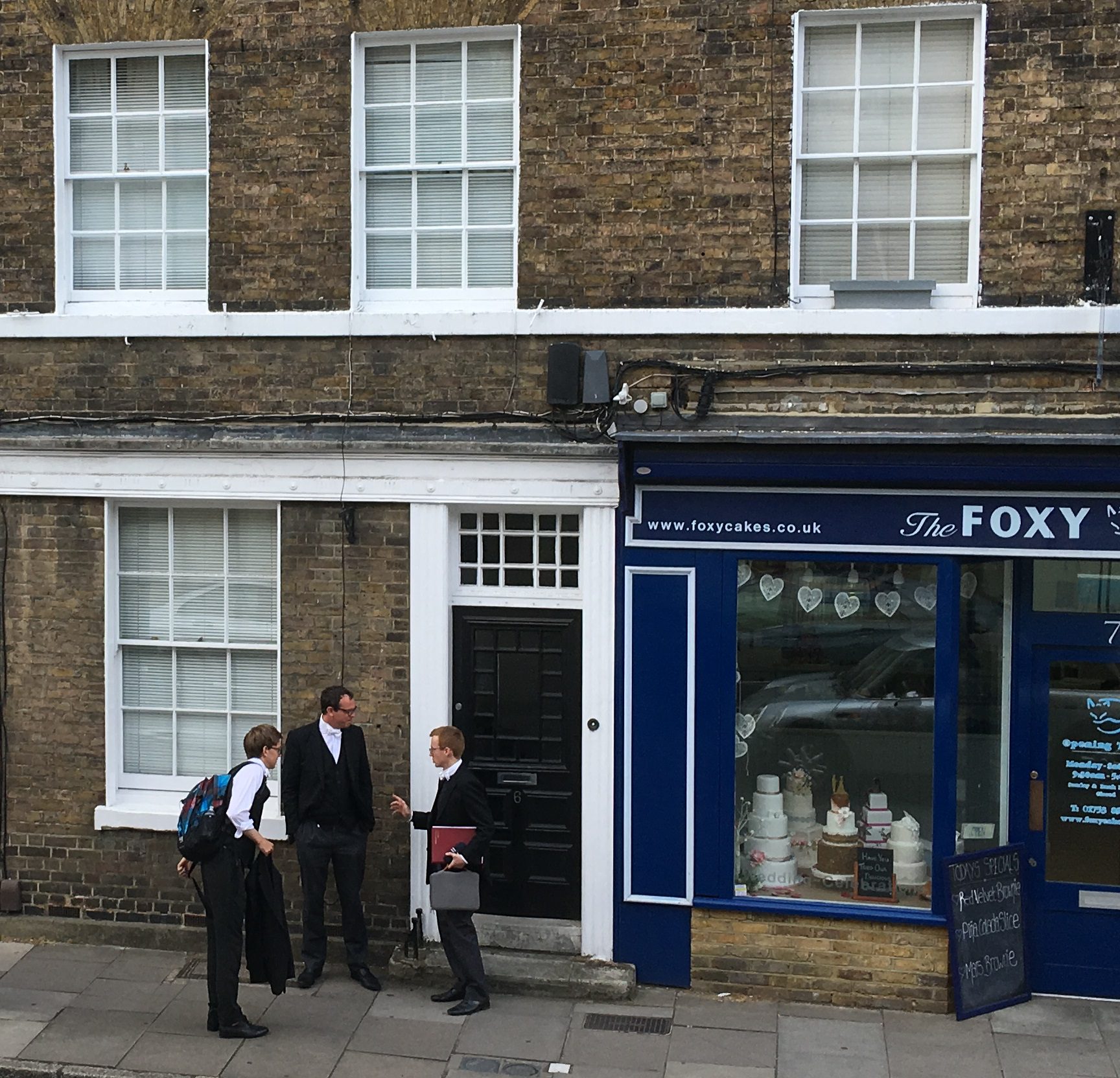 Sam’s place is like the three-story building on the left. It’s above a tailor’s shop. Lest you think I just gave away the location of the house because there is only one tailor shop in your city of half a million people, there are seven tailor shops in Eton and neighboring Windsor to care for the uniforms the students and masters (teachers image removed due to copyright issues) must wear: