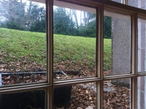 Was it originally a fortified outpost? It’s set down in a depression; below is a view from the ground-floor kitchen. Four or 500 years ago, was the ground close to the house even lower, and filled with water? Lynn and Richard think the original structure was built in the 16th Century, so there’s really no way of knowing these things without spending a lot of time in musty archives.