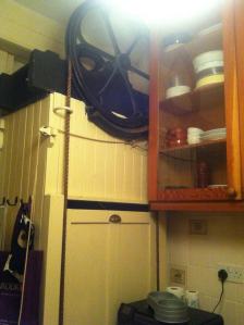 The door, covered with the cloth of the Gordon family tartan, separates the front of the house from the back. In the Gordon family heyday, the family would entertain in the front-side rooms, which have 20 foot ceilings and views of the hills. Behind the tartan door, the help would be running up and down from the kitchen or using the dumbwaiter (below) to move food and libations up to the first floor butler’s pantry to be staged for serving.