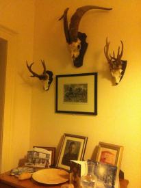 Dunrovin has the things that, in my mind, make a house Scottish—lots of heads on the walls, a fireplace in every room, and a tartan door.