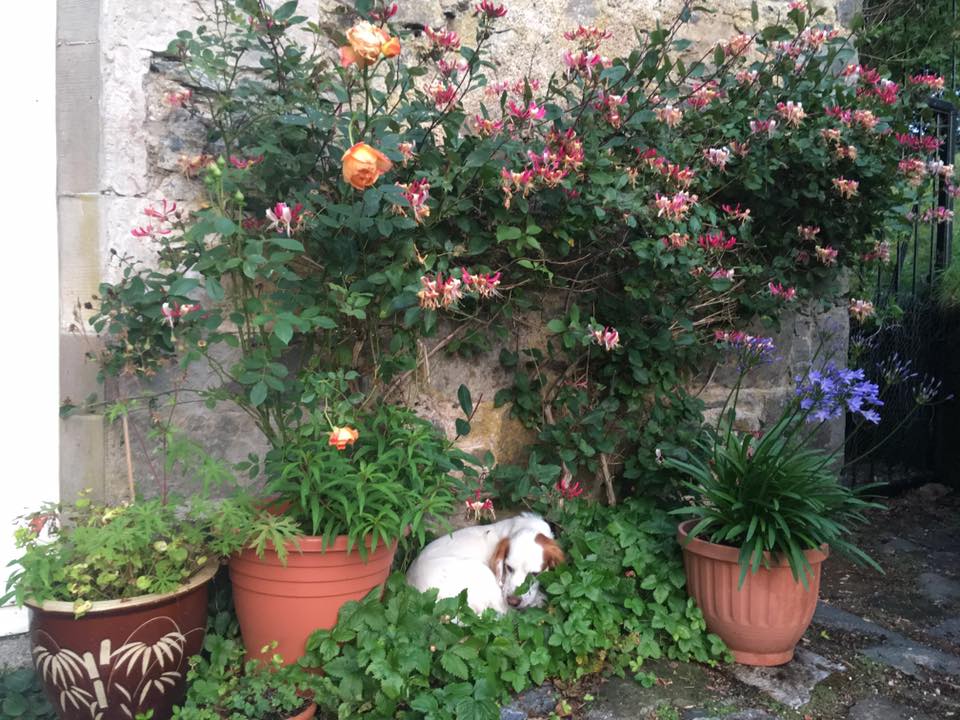 Then there are the spaniels, Merry and Pippin.  Sigh. I was there a few years ago when they arrived as puppies.  I think the word “flibbertigibbet” could have been coined for them.  Hyper, destructive, everywhere at once—normal puppies.  There are some who think Merry may be a Special Needs dog.  The spaniels had mellowed a little bit, but the phrase, “Nooo!!!  Merry, you idiot!” was still to be heard several times a day.  This is a rare moment of peace in the garden.