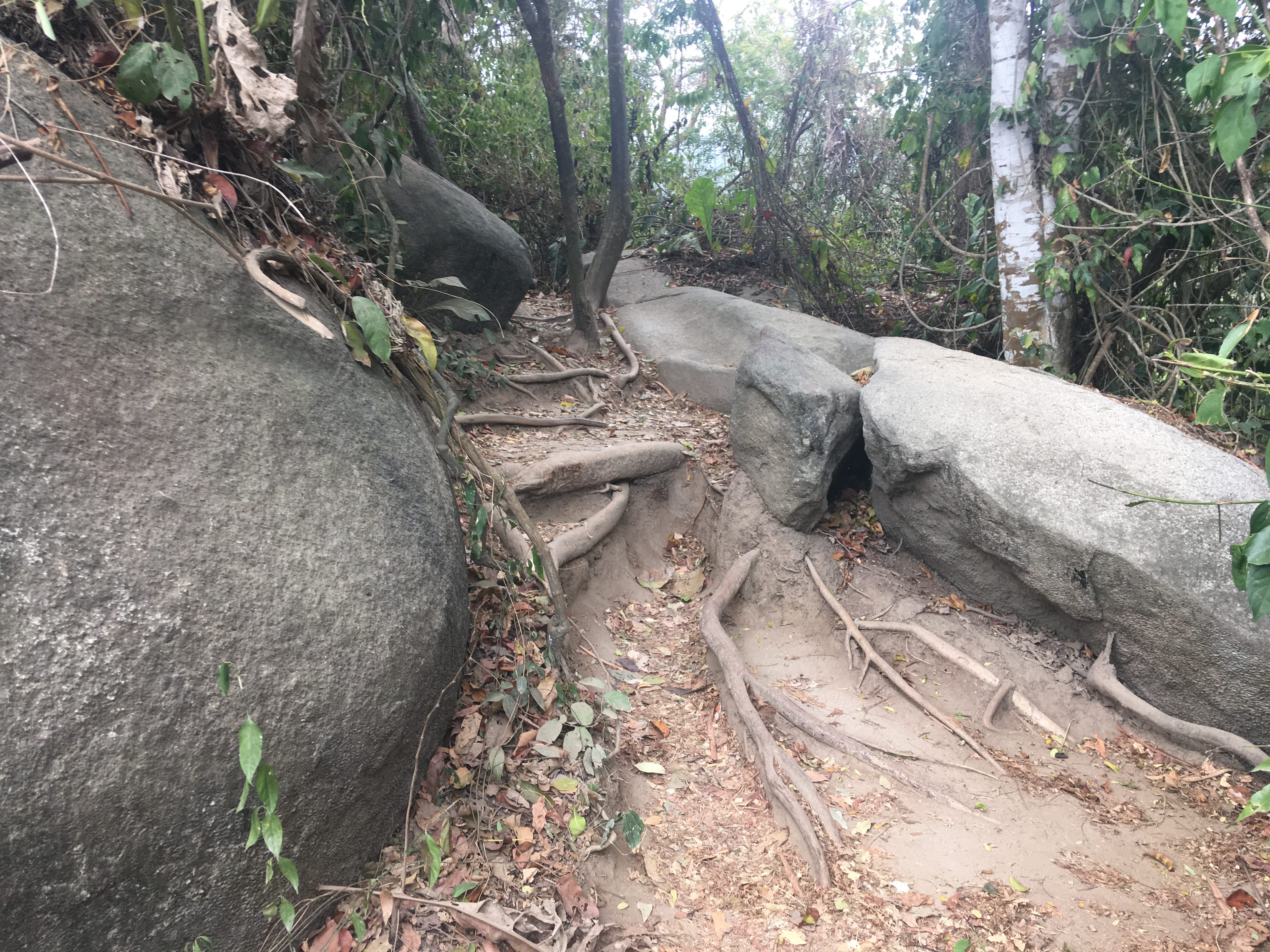 The trail quickly turned into a boulder-strewn nightmare. Since I had packed my camera away, I have no photos from this episode but they would be blurs anyway. The path below is a tame version of what we did. Wherever we were was, literally, just piles of football-size rocks strewn along hills and valleys.