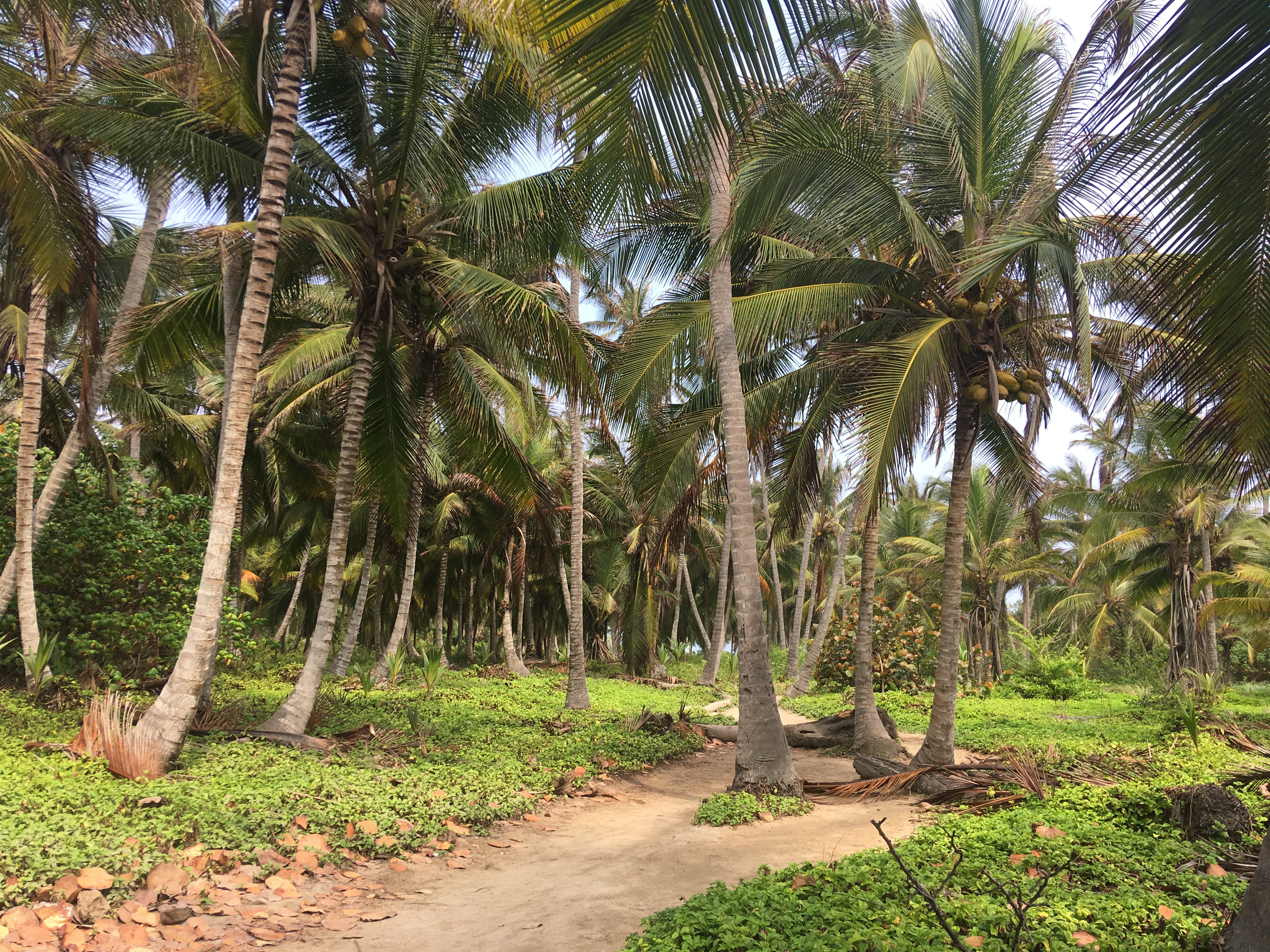 The path split into four or five trails, some leading into the jungle, some splitting around gigantic banyan trees and reconnecting on the other side, others heading in what we presumed was the direction of the ocean. I tried taking photos of the banyan trees but it was impossible to capture their scale. This is a section of path that wound through a coconut grove.
