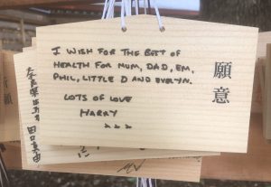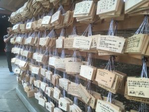 I had seen small wooden plaques at the shrine I’d visited the day before, but since my visit coincided with a torrential downpour I hadn’t lingered to inspect them. Today it was dry. This is just one of five or six walls of plaques. After observing for a while, I figured out that you buy a plaque at a little kiosk, write a prayer on it, then leave it behind—presumably in hopes that the Emperor’s or Empress’s deity will grant your wish.