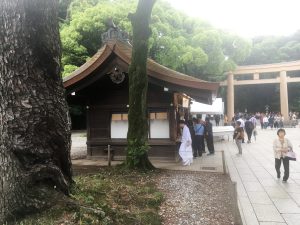 But arriving at the shrine was like sinking into distant time and place. The shrine—and I don’t know what makes it different from a temple—enshrines the deified spirits (but not the bodies) of the Emperor Meiji and Empress Shōken.