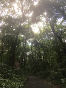 The shrine is surrounded by 170 acres of woodland and gardens. The trees were so enormous it was difficult to capture them “on film.” If you can make out the people in the photo below, it will give you a sense of the scale.