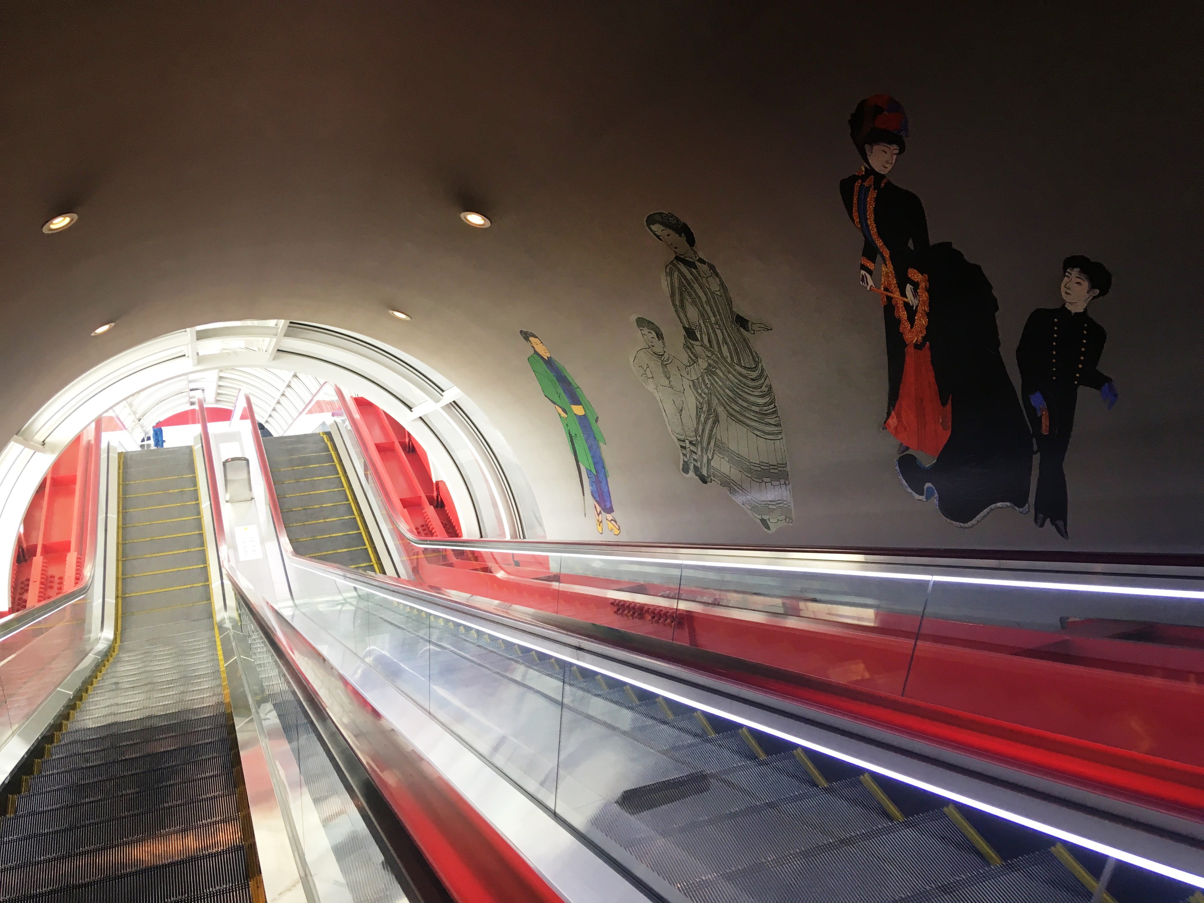 It is basically built on stilts, and you take a very long escalator to the sixth floor of museum, then work your way down.  Lynn and I had never seen an escalator that turned into a people mover (a moving walkway), back into an escalator, and so on.  It was marvelous.