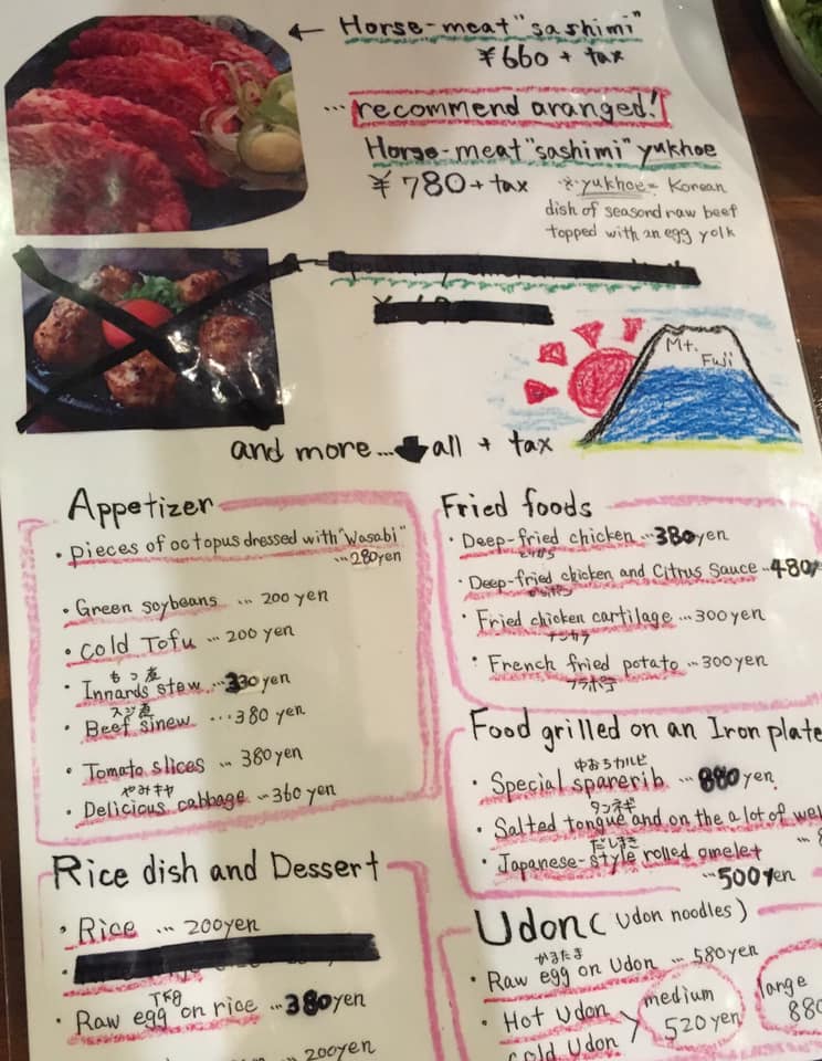 Japan is a land of contrasts. Later that evening we dined in a dive that featured horse meat sashimi, innards stew, and deep-fried chicken cartilage. Some of the customers were smoking inside, something I experienced here and there throughout the month.