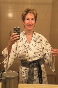 “Will do,” I replied. The connection failed so I took selfies of myself in the Nara Hotel yukata. I never take selfies, so you know I was feeling good.