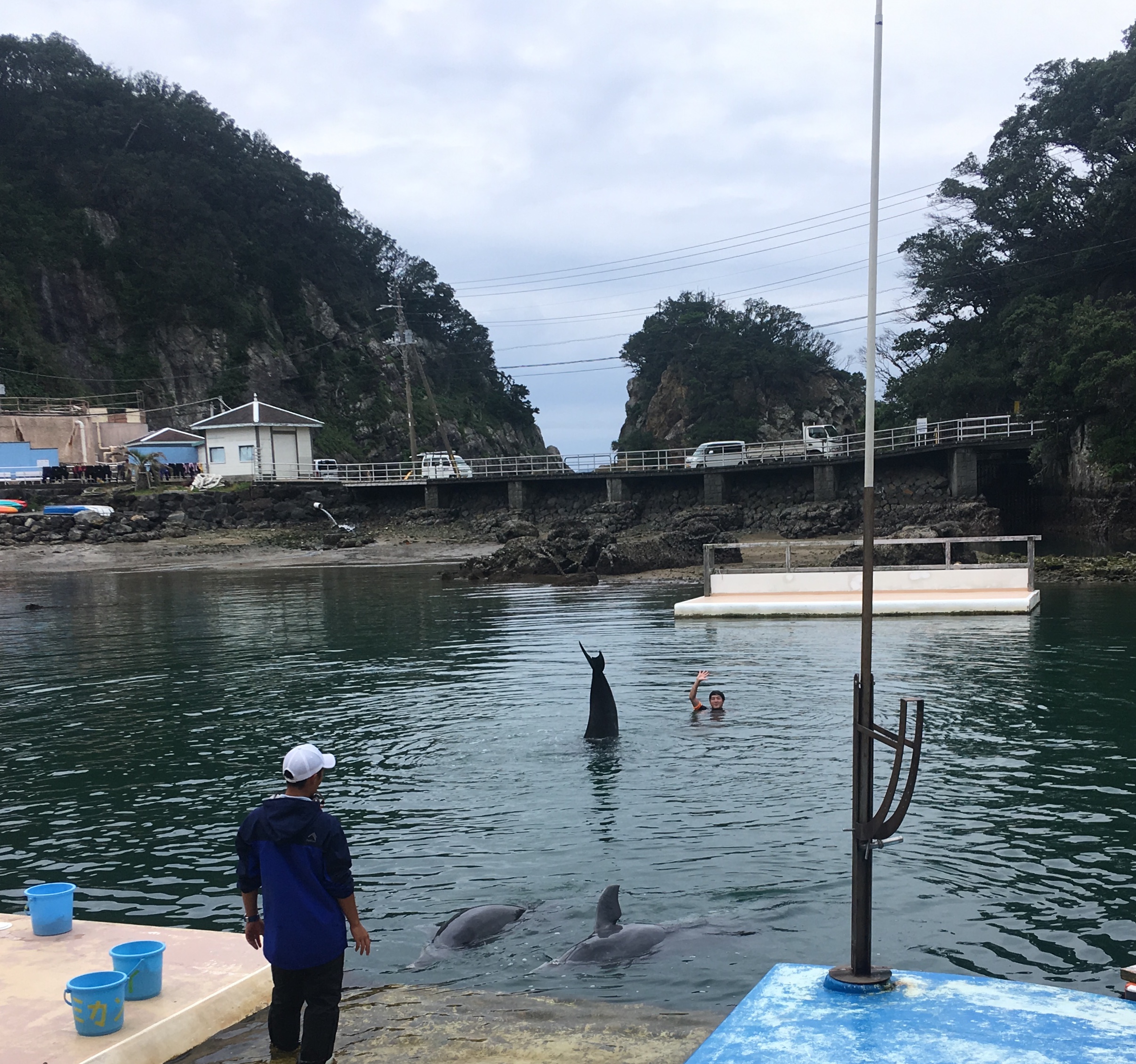 The trainers bribed the dolphins to dive or leap to get fish; the highlight was when one of the trainers stood on a dolphin’s back and rode it like a surf board.