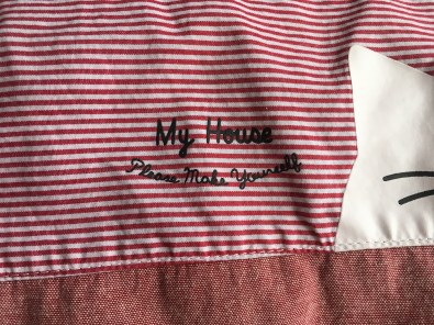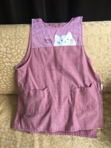 He dragged himself back to the arcade and I doubled down on my shopping. I bought a pair of strange cat slippers for Lynn, and a housedress.  I bought one for myself, too.  I’ve actually worn it quite a bit; here it is in its wrinkled glory on my couch.  The saying on top is, “My House: Please Make Yourself”