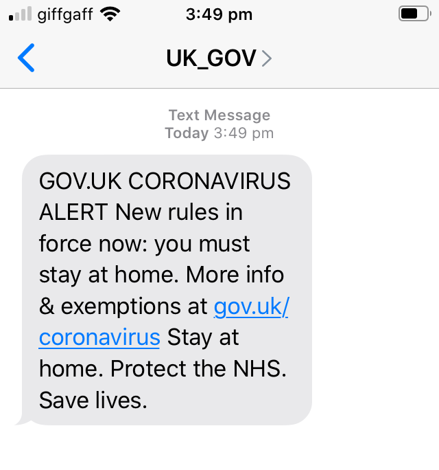 We are allowed to go to stores for food and medicines; all other stores, pubs, restaurants, and other venues are now closed. We’re also allowed to get out for exercise once a day.