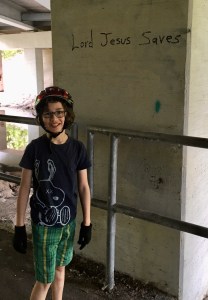 Being around children usually involves laughing. I took my nephews for a bike ride. The nine-year-old tried to do a trick and fell sideways. It could have been disastrous, but he sprang up, and there was this message spray painted on the wall over his head. “I guess lord Jesus saved me!” he joked.