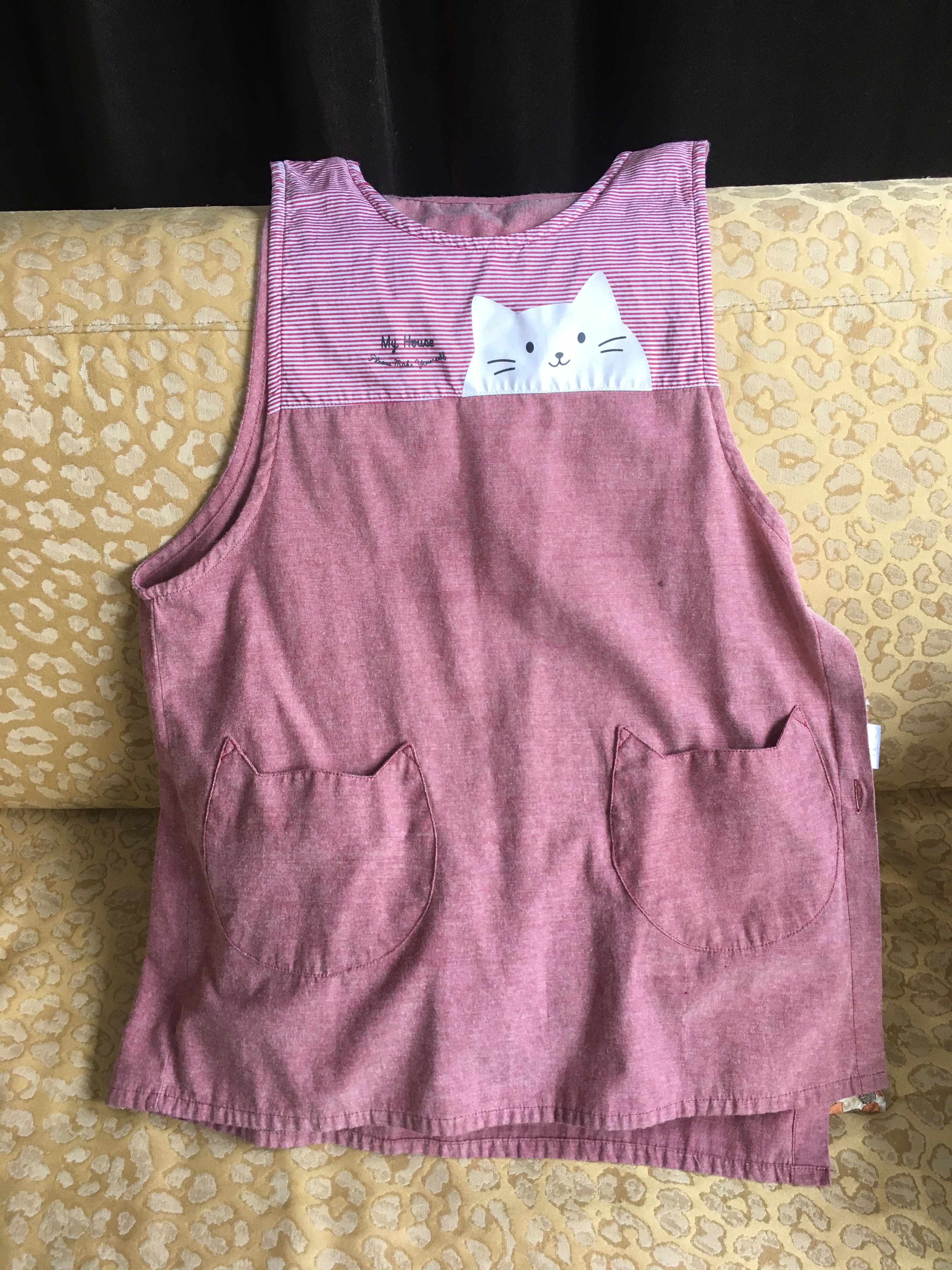 He dragged himself back to the arcade and I doubled down on my shopping. I bought a pair of strange cat slippers for Lynn, and a housedress. I bought one for myself, too. I’ve actually worn it quite a bit; here it is in its wrinkled glory on my couch. The saying on top is, “My House: Please Make Yourself”